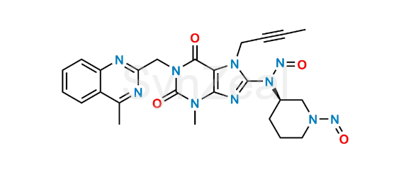 Linagliptin Regio Isomer Dinitroso Impurity is chemically (R)-N-(7-(but-2-yn-1-yl)-3-methyl-1-((4-methylquinazolin-2-yl)methyl)-2,6-dioxo-2,3,6,7-tetrahydro-1H-purin-8-yl)-N-(1-nitrosopiperidin-3-yl)nitrous amide. Linagliptin Regio Isomer Dinitroso Impurity is supplied with detailed characterization data compliant with regulatory guideline. Linagliptin Regio Isomer Dinitroso Impurity can be used for the analytical method development, method validation (AMV), Quality Controlled (QC) application for Abbreviated New Drug Application (ANDA) or during commercial production of Linagliptin.