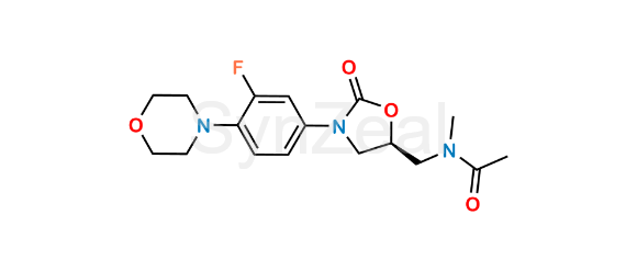 Linezolid N-Methyl Impurity is chemically N-[[(5S)-3-[3-fluoro-4-(4-morpholinyl)phenyl]-2-oxo-5-oxazolidinyl] methyl] N-methyl-acetamide ;. Linezolid N-Methyl Impurity is supplied with detailed characterization data compliant with regulatory guideline. Linezolid N-Methyl Impurity can be used for the analytical method development, method validation (AMV), Quality Controlled (QC) application for Abbreviated New Drug Application (ANDA) or during commercial production of Linezolid.