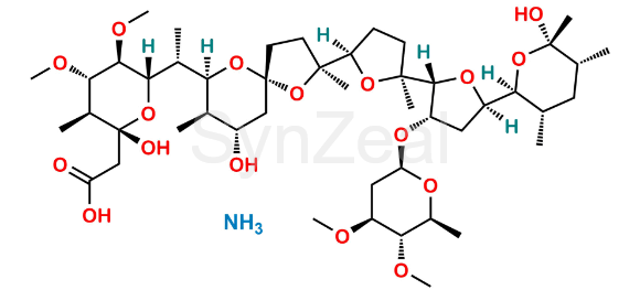 Chemical Name: 2-((2R,3S,4S,5R,6S)-6-((R)-1-((2S,5R,7S,8R,9S)-2-((2S,2'R,3'S,5R,5'R)-3'-(((2R,4S,5S,6S)-4,5-dimethoxy-6-methyltetrahydro-2H-pyran-2-yl)oxy)-5'-((2S,3S,5R,6S)-6-hydroxy-3,5,6-trimethyltetrahydro-2H-pyran-2-yl)-2-methyloctahydro-[2,2'-bifuran]-5-yl)-9-hydroxy-2,8-dimethyl-1,6-dioxaspiro[4.5]decan-7-yl)ethyl)-2-hydroxy-4,5-dimethoxy-3-methyltetrahydro-2H-pyran-2-yl)acetic acid, ammonia salt