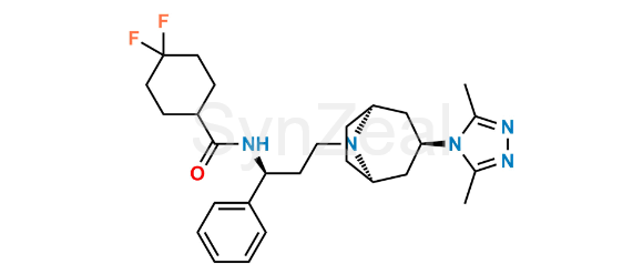 Maraviroc Impurity 1 is chemically 4,4-Difluoro-N-[(1S)-3-[(3-endo)-3-[3-methyl-5-(1-methylethyl)-4H-1,2,4-triazol-4-yl]-8-azabicyclo [3.2.1]oct-8-yl]-1-phenylpropyl]-cyclohexnecarboxamide. Maraviroc Impurity 1 is supplied with detailed characterization data compliant with regulatory guideline. Maraviroc Impurity 1 can be used for the analytical method development, method validation (AMV), Quality Controlled (QC) application for Abbreviated New Drug Application (ANDA) or during commercial production of Maraviroc.