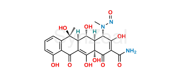 N-Nitroso-N-Desmethyl Oxytetracycline is chemically (4S,4aR,5S,5aR,6S,12aS)-3,5,6,10,12,12a-hexahydroxy-6-methyl-4-(methyl(nitroso)amino)-1,11-dioxo-1,4,4a,5,5a,6,11,12a-octahydrotetracene-2-carboxamide. N-Nitroso-N-Desmethyl Oxytetracycline is supplied with detailed characterization data compliant with regulatory guideline. N-Nitroso-N-Desmethyl Oxytetracycline can be used for the analytical method development, method validation (AMV), Quality Controlled (QC) application for Abbreviated New Drug Application (ANDA) or during commercial production of Oxytetracycline.