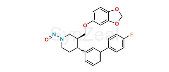 N-Nitroso Paroxetine EP Impurity J is chemically (3S,4R)-3-((Benzo[d][1,3]dioxol-5-yloxy)methyl)-4-(4'-fluoro-[1,1'-biphenyl]-3-yl)-1-nitrosopiperidine. N-Nitroso Paroxetine EP Impurity J is supplied with detailed characterization data compliant with regulatory guideline. N-Nitroso Paroxetine EP Impurity J can be used for the analytical method development, method validation (AMV), Quality Controlled (QC) application for Abbreviated New Drug Application (ANDA) or during commercial production of Paroxetine.