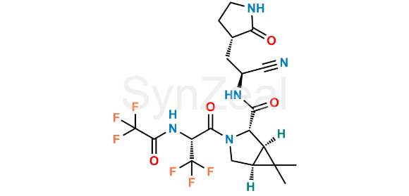 Nirmatrelvir Impurity 21 is chemically (1R,2S,5S)-N-((S)-1-cyano-2-((S)-2-oxopyrrolidin-3-yl)ethyl)-6,6-dimethyl-3-((R)-3,3,3-trifluoro-2-(2,2,2-trifluoroacetamido)propanoyl)-3-azabicyclo[3.1.0]hexane-2-carboxamide. Nirmatrelvir Impurity 21 is supplied with detailed characterization data compliant with regulatory guideline. Nirmatrelvir Impurity 21 can be used for the analytical method development, method validation (AMV), Quality Controlled (QC) application for Abbreviated New Drug Application (ANDA) or during commercial production of Nirmatrelvir.