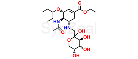 Oseltamivir Fructose Adduct-1 is chemically Ethyl (3R,4R,5S)-4-acetamido-3-(pentan-3-yloxy)-5-((((3S,4R,5R)-2,3,4,5-tetrahydroxytetrahydro-2H-pyran-2-yl)methyl)amino)cyclohex-1-ene-1-carboxylate. Oseltamivir Fructose Adduct-1 is supplied with detailed characterization data compliant with regulatory guideline. Oseltamivir Fructose Adduct-1 can be used for the analytical method development, method validation (AMV), Quality Controlled (QC) application for Abbreviated New Drug Application (ANDA) or during commercial production of Oseltamivir.