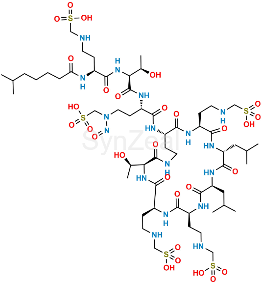 Chemical Name: (5S,8S,11S)-8-((R)-1-Hydroxyethyl)-5-(((3S,6S,9S,12S,15R,18S,21S)-3-((R)-1-hydroxyethyl)-12,15-diisobutyl-2,5,8,11,14,17,20-heptaoxo-6,9,18-tris(2-((sulfomethyl)amino)ethyl)-1,4,7,10,13,16,19-heptaazacyclotricosan-21-yl)carbamoyl)-11-(6-methylheptanamido)-2-nitroso-7,10-dioxo-2,6,9,14-tetraazapentadecane-1,15-disulfonic acid