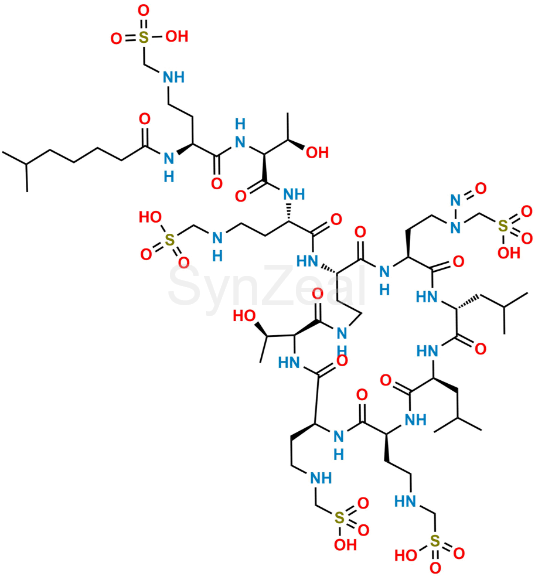 Chemical Name: (5S,8S,11S)-8-((R)-1-hydroxyethyl)-5-(((3S,6S,9S,12S,15R,18S,21S)-3-((R)-1-hydroxyethyl)-12,15-diisobutyl-18-(2-(nitroso(sulfomethyl)amino)ethyl)-2,5,8,11,14,17,20-heptaoxo-6,9-bis(2-((sulfomethyl)amino)ethyl)-1,4,7,10,13,16,19-heptaazacyclotricosan-21-yl)carbamoyl)-11-(6-methylheptanamido)-7,10-dioxo-2,6,9,14-tetraazapentadecane-1,15-disulfonic acid