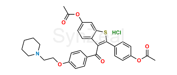 Raloxifene Diacyl analog is chemically 4-(6-acetoxy-3-(4-(2-(piperidin-1-yl)ethoxy)benzoyl)benzo[b]thiophen-2-yl)phenyl acetate hydrochloride. Raloxifene Diacyl analog is supplied with detailed characterization data compliant with regulatory guideline. Raloxifene Diacyl analog can be used for the analytical method development, method validation (AMV), Quality Controlled (QC) application for Abbreviated New Drug Application (ANDA) or during commercial production of Raloxifene.