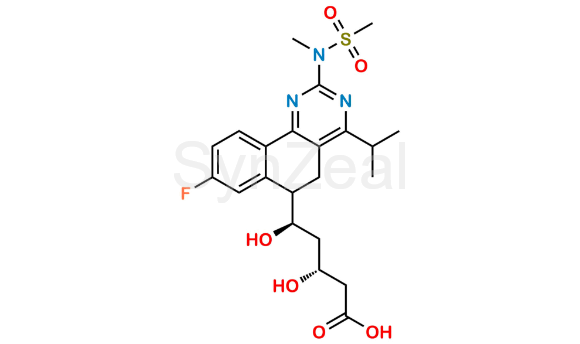 Rosuvastatin Impurity 65 is chemically (3R,5R)-5-(8-Fluoro-4-isopropyl-2-(N-methylmethylsulfonamido)-5,6-dihydrobenzo[h]quinazolin-6-yl)-3,5-dihydroxypentanoic acid. Rosuvastatin Impurity 65 is supplied with detailed characterization data compliant with regulatory guideline. Rosuvastatin Impurity 65 can be used for the analytical method development, method validation (AMV), Quality Controlled (QC) application for Abbreviated New Drug Application (ANDA) or during commercial production of Rosuvastatin.