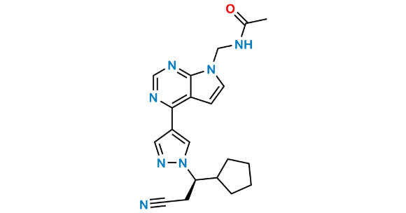 N-Methyl Acetamide Ruxolitinib is chemically (R)-N-((4-(1-(2-cyano-1-cyclopentylethyl)-1H-pyrazol-4-yl)-7H-pyrrolo[2,3-d]pyrimidin-7-yl)methyl)acetamide. N-Methyl Acetamide Ruxolitinib is supplied with detailed characterization data compliant with regulatory guideline. N-Methyl Acetamide Ruxolitinib can be used for the analytical method development, method validation (AMV), Quality Controlled (QC) application for Abbreviated New Drug Application (ANDA) or during commercial production of Ruxolitinib.