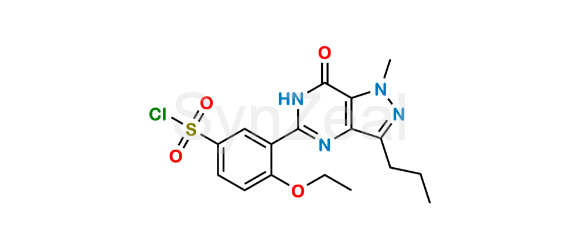 Sildenafil Chlorosulfone Impurity is chemically 5-(5-Chlorosulfonyl-2-ethoxyphenyl)-1-methyl-3-propyl-1,6-dihydro-7H-pyrazole[4,3-d]pyrimidine-7-one . Sildenafil Chlorosulfone Impurity is supplied with detailed characterization data compliant with regulatory guideline. Sildenafil Chlorosulfone Impurity can be used for the analytical method development, method validation (AMV), Quality Controlled (QC) application for Abbreviated New Drug Application (ANDA) or during commercial production of Sildenafil .