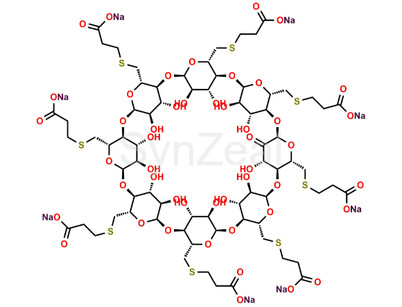 Sugammadex Impurity K is chemically 3-({10,15,20,25,30,35,40-Heptakis[(2-carboxyethylthio)methyl]-41,42,43,44,45,46,47,48,49,50,51,52,53,54,55,56-pentadecahydroxy-55-oxo-2,4,7,9,12,14,17,19,22,24,27,29,32,34,37,39-hexadecoxanonacyclo[36.2.2.23.6.28.11.213.16.218.21.223.26.228.31.233.36]hexapentacont-5-yl}methylthio)propionic acid sodium salt. Sugammadex Impurity K is supplied with detailed characterization data compliant with regulatory guideline. Sugammadex Impurity K can be used for the analytical method development, method validation (AMV), Quality Controlled (QC) application for Abbreviated New Drug Application (ANDA) or during commercial production of Sugammadex.