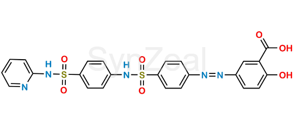 Sulfasalazine Impurity 1 is chemically 2-Hydroxy-5-((4-(N-(4-(N-(pyridin-2-yl)sulfamoyl)phenyl)sulfamoyl)phenyl)diazenyl)benzoic acid. Sulfasalazine Impurity 1 is supplied with detailed characterization data compliant with regulatory guideline. Sulfasalazine Impurity 1 can be used for the analytical method development, method validation (AMV), Quality Controlled (QC) application for Abbreviated New Drug Application (ANDA) or during commercial production of Sulfasalazine.