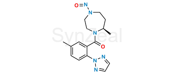 Suvorexant Nitroso Impurity 1 is chemically (R)-(5-methyl-2-(2H-1,2,3-triazol-2-yl)phenyl)(7-methyl-4-nitroso-1,4-diazepan-1-yl)methanone. Suvorexant Nitroso Impurity 1 is supplied with detailed characterization data compliant with regulatory guideline. Suvorexant Nitroso Impurity 1 can be used for the analytical method development, method validation (AMV), Quality Controlled (QC) application for Abbreviated New Drug Application (ANDA) or during commercial production of Suvorexant.
