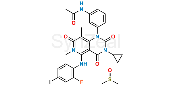 Trametinib Dimethyl Sulfoxide is chemically N-(3-(3-Cyclopropyl-5-((2-fluoro-4-iodophenyl)amino)-6,8-dimethyl-2,4,7-trioxo-3,4,6,7-tetrahydropyrido[4,3-d]pyrimidin-1(2H)-yl)phenyl)acetamide compound with (methylsulfinyl)methane (1:1). Trametinib Dimethyl Sulfoxide is supplied with detailed characterization data compliant with regulatory guideline. Trametinib Dimethyl Sulfoxide can be used for the analytical method development, method validation (AMV), Quality Controlled (QC) application for Abbreviated New Drug Application (ANDA) or during commercial production of Trametinib.