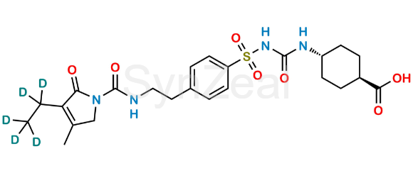 trans-Carboxy Glimepiride-D5 is chemically (1r,4r)-4-(3-((4-(2-(3-(ethyl-d5)-4-methyl-2-oxo-2,5-dihydro-1H-pyrrole-1-carboxamido)ethyl)phenyl)sulfonyl)ureido)cyclohexane-1-carboxylic acid. trans-Carboxy Glimepiride-D5 is supplied with detailed characterization data compliant with regulatory guideline. trans-Carboxy Glimepiride-D5 can be used for the analytical method development, method validation (AMV), Quality Controlled (QC) application for Abbreviated New Drug Application (ANDA) or during commercial production of Glimepiride.