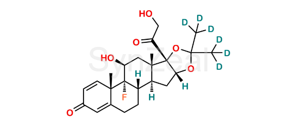 Triamcinolone Acetonide D6 is chemically (6aS,6bR,7S,8aS,8bS,11aR,12aS,12bS)-6b-fluoro-7-hydroxy-8b-(2-hydroxyacetyl)-6a,8a-dimethyl-10,10-bis(methyl-d3)-1,2,6a,6b,7,8,8a,8b,11a,12,12a,12b-dodecahydro-4H-naphtho[2',1':4,5]indeno[1,2-d][1,3]dioxol-4-one. Triamcinolone Acetonide D6 is supplied with detailed characterization data compliant with regulatory guideline. Triamcinolone Acetonide D6 can be used for the analytical method development, method validation (AMV), Quality Controlled (QC) application for Abbreviated New Drug Application (ANDA) or during commercial production of Triamcinolone Acetonide.
