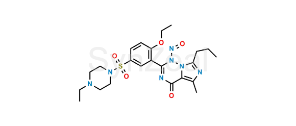 Vardenafil Nitroso Impurity 1 is chemically 2-(2-Ethoxy-5-((4-ethylpiperazin-1-yl)sulfonyl)phenyl)-5-methyl-1-nitroso-7-propylimidazo[5,1-f][1,2,4]triazin-4(1H)-one. Vardenafil Nitroso Impurity 1 is supplied with detailed characterization data compliant with regulatory guideline. Vardenafil Nitroso Impurity 1 can be used for the analytical method development, method validation (AMV), Quality Controlled (QC) application for Abbreviated New Drug Application (ANDA) or during commercial production of Vardenafil.