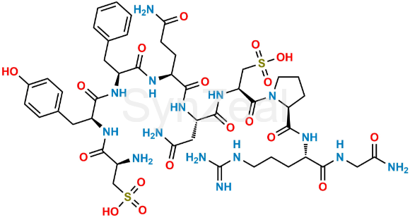 Vasopressin Di-Sulfonic Acid Impurity is chemically (2R,5S,8S,11S,14S,17R)-17-amino-5-(2-amino-2-oxoethyl)-2-((S)-2-(((S)-1-((2-amino-2-oxoethyl)amino)-5-guanidino-1-oxopentan-2-yl)carbamoyl)pyrrolidine-1-carbonyl)-8-(3-amino-3-oxopropyl)-11-benzyl-14-(4-hydroxybenzyl)-4,7,10,13,16-pentaoxo-3,6,9,12,15-pentaazaoctadecane-1,18-disulfonic acid. Vasopressin Di-Sulfonic Acid Impurity is supplied with detailed characterization data compliant with regulatory guideline. Vasopressin Di-Sulfonic Acid Impurity can be used for the analytical method development, method validation (AMV), Quality Controlled (QC) application for Abbreviated New Drug Application (ANDA) or during commercial production of Vasopressin.