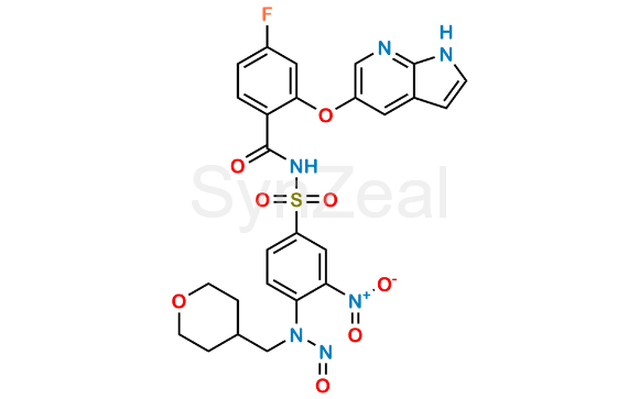 Venetoclax Nitroso Impurity 7 is chemically 2-((1H-pyrrolo[2,3-b]pyridin-5-yl)oxy)-4-fluoro-N-((3-nitro-4-(nitroso((tetrahydro-2H-pyran-4-yl)methyl)amino)phenyl)sulfonyl)benzamide. Venetoclax Nitroso Impurity 7 is supplied with detailed characterization data compliant with regulatory guideline. Venetoclax Nitroso Impurity 7 can be used for the analytical method development, method validation (AMV), Quality Controlled (QC) application for Abbreviated New Drug Application (ANDA) or during commercial production of Venetoclax.